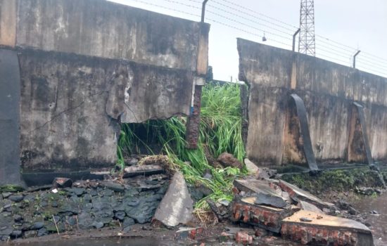 Ternate - Tembok sisi selatan Stadion Gelora Kie Raha, Ternate, Maluku Utara, tepatnya di belakang gawang ambruk, sekitar pukul 12.00 WIT, Senin 19 Juni 2023.