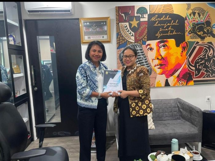 Bupati Pulau Taliabu, Sashabila Widya L Mus saat menyerahkan proposal pembangunan infrastruktur kepada Anggota DPR RI Komisi V, Irine Yusiana Roba Putri. Foto: Ist