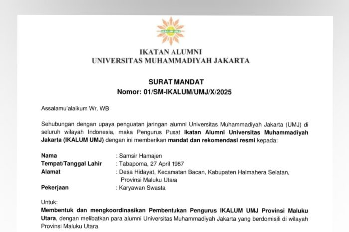 Pengurus Pusat Ikatan Alumni Universitas Muhammadiyah Jakarta (IKALUM UMJ) resmi memberikan mandat kepada Samsir Hamajen untuk membentuk kepengurusan IKALUM UMJ di Provinsi Maluku Utara.
