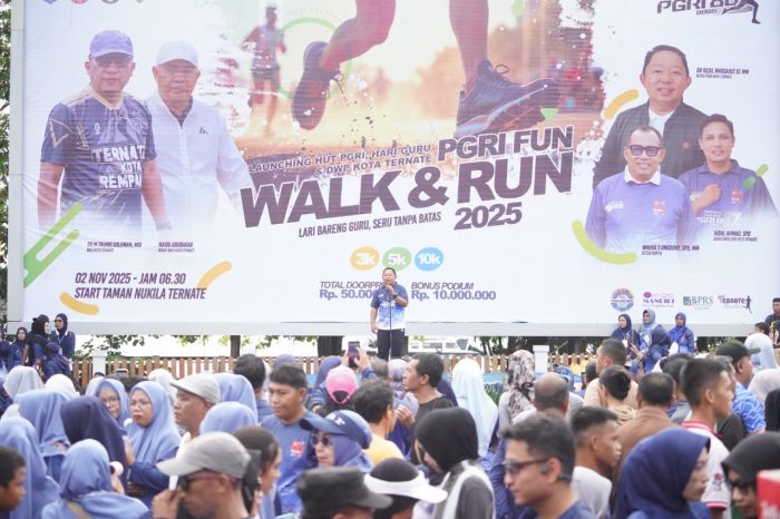 Suasana pagi di Taman Nukila, Kota Ternate, pada Minggu, 2 November 2025 terasa berbeda. Ratusan guru, aparatur pemerintah, dan masyarakat tampak antusias mengikuti kegiatan Fun Walk and Run dalam rangka memperingati Hari Ulang Tahun (HUT) ke-80 Persatuan Guru Republik Indonesia (PGRI) dan Hari Guru Nasional.