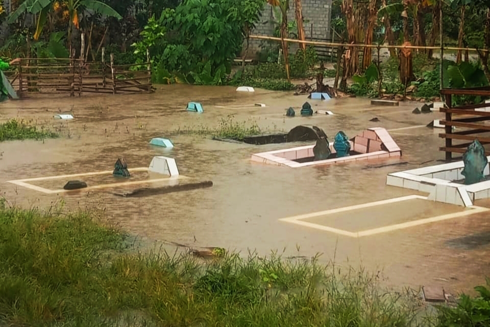 “Air terendam itu karena tadi hujan deras kurang lebih 1 jam pagi. Makanya air dari kebun Dudu itu meluap ke kuburan sampai ke rumah warga,” ujarnya melalui pesan WhatsApp.