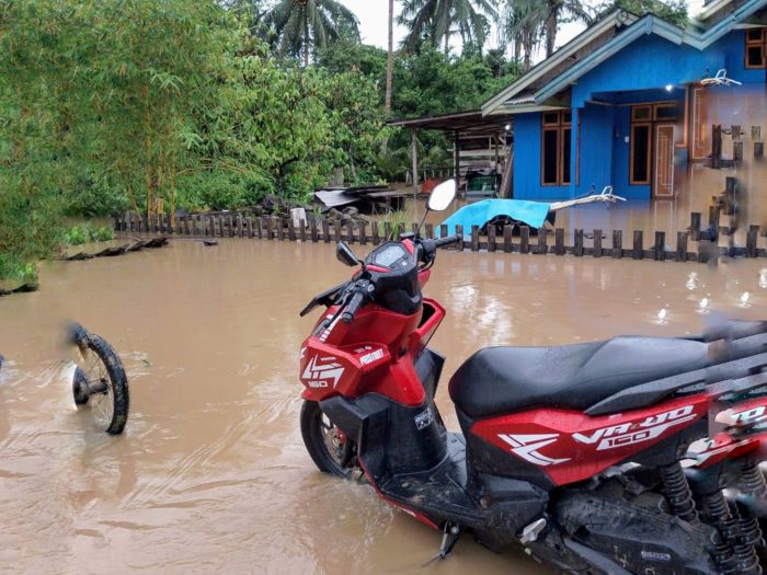 Ratusan rumah warga Desa Sumber Makmur, Kecamatan Gane Timur, Kabupaten Halmahera Selatan, Maluku Utara, terendam banjir akibat hujan deras yang mengguyur desa tersebut selama dua hari.