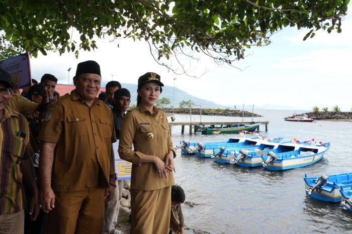 Gubernur Maluku Utara, Sherly Laos bersama Kepala Dinas Kelautan dan Perikanan (DKP) Fauzi Momole saat penyerahan bantuan kapal untuk Nelayan Jambula Ternate. Foto: Humas Pemprov Malut