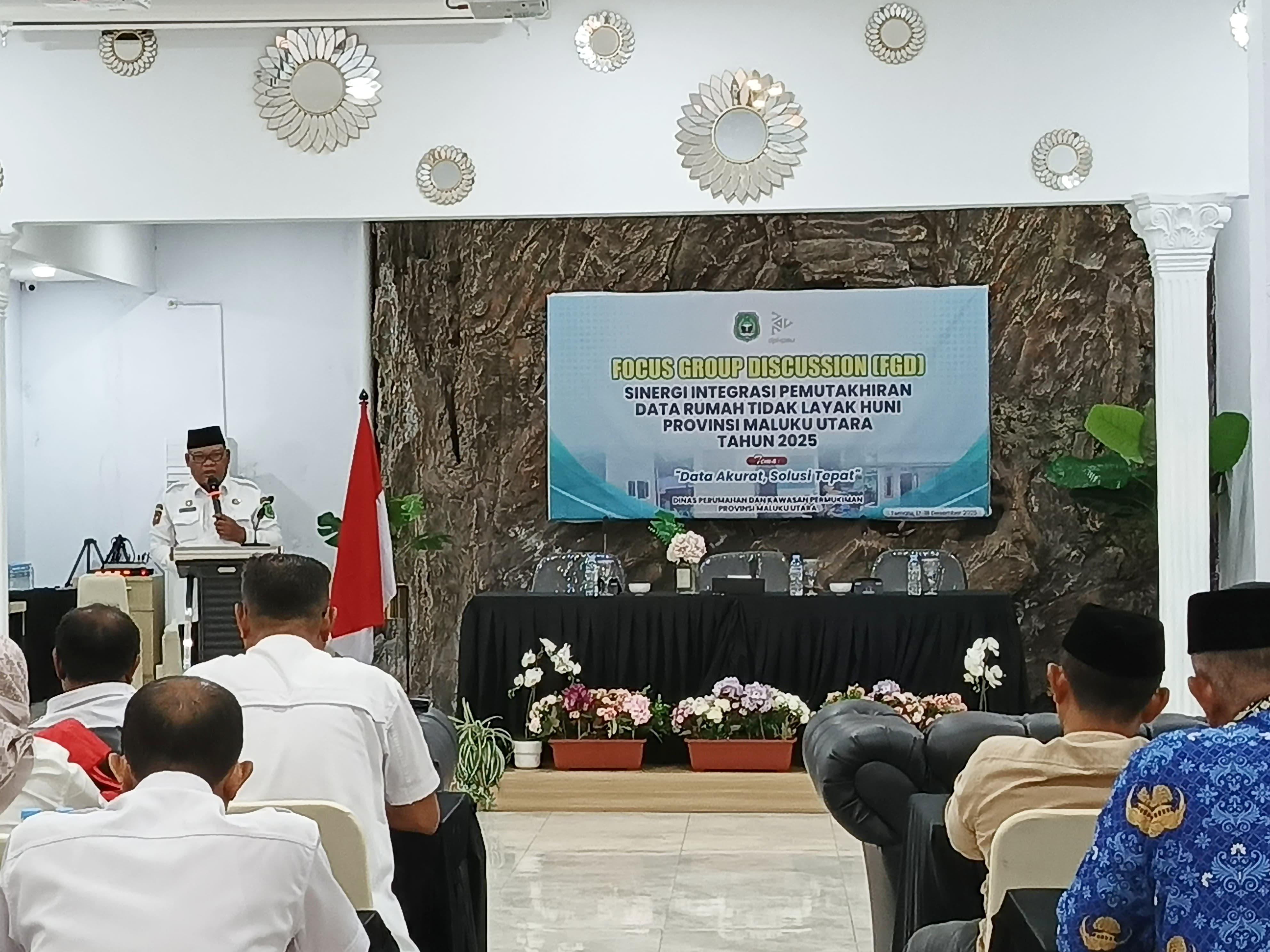 Sekretaris Daerah (Sekda) Provinsi Maluku Utara, Samsuddin A. Kadir, resmi membuka Focus Group Discussion (FGD) Sinergi Integrasi Pemutakhiran Data Rumah Tidak Layak Huni (RTLH) Provinsi Maluku Utara Tahun 2025, di Ternate, pada Rabu, 17 Desember 2025.