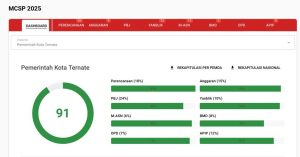 Kota Ternate berhasil menempati posisi pertama dalam penilaian Monitoring, Controlling, Surveillance for Prevention (MCSP) KPK 2025, dengan capaian 91 persen, meningkat dari 87,7 persen pada penilaian sebelumnya.