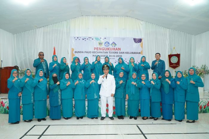 Pelantikan tersebut dirangkaikan dengan pengukuhan Bunda PAUD Kecamatan Tidore serta Bunda PAUD kelurahan se-Kecamatan Tidore masa bakti 2026–2030.