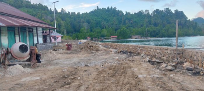 Pembangunan proyek talud penahan ombak di Desa Sidopo, Halmahera Selatan. Foto: Din