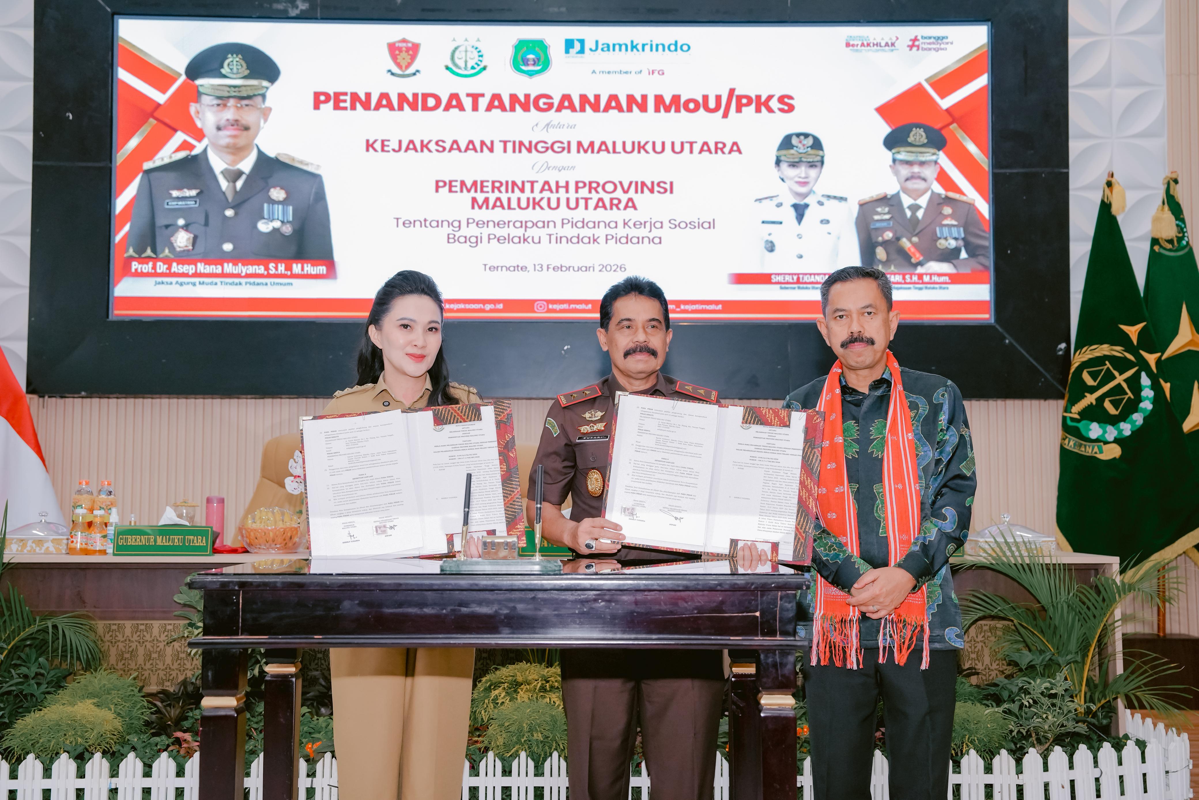 Pemerintah Provinsi (Pemprov) Maluku Utara bersama Kejaksaan Tinggi (Kejati) Maluku Utara resmi menandatangani Nota Kesepahaman (MoU) tentang Kerja Sama Pelaksanaan Pidana Kerja Sosial bagi pelaku tindak pidana, di Aula Fala Lamo Kejati, Jumat, 13 Februari 2026.