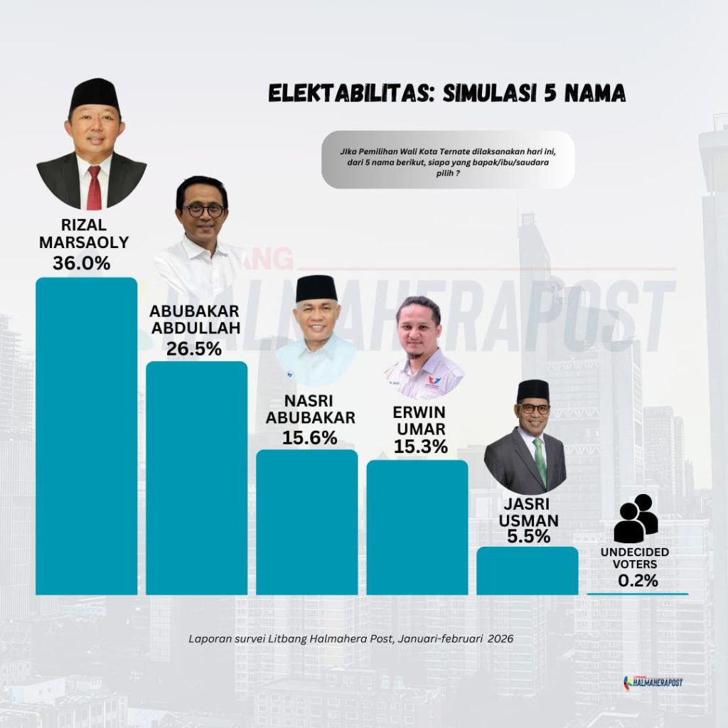 Pada simulasi lima nama, Rizal Marsaoly menguat ke angka 36,0 persen. Nasri Abubakar dan Abubakar Abdullah bersaing ketat di kisaran 15 persen, masing-masing 15,6 persen dan 15,3 persen. Erwin Umar memperoleh 5,5 persen, sedangkan Jasri Usman 0,2 persen. Dalam simulasi ini, undecided voters masih cukup tinggi yakni 26,5 persen, menandakan ruang kompetisi masih terbuka.