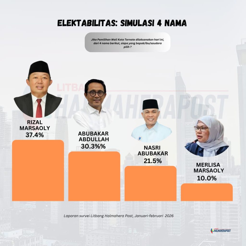 Ketika disimulasikan empat nama, Rizal Marsaoly tetap memimpin dengan 37,4 persen. Abubakar Abdullah menyusul dengan 30,3 persen, kemudian Nasri Abubakar 21,5 persen dan Merlisa Marsaoly 10,0 persen. Konfigurasi ini menunjukkan potensi pertarungan dua poros jika kontestasi mengerucut pada figur-figur utama.