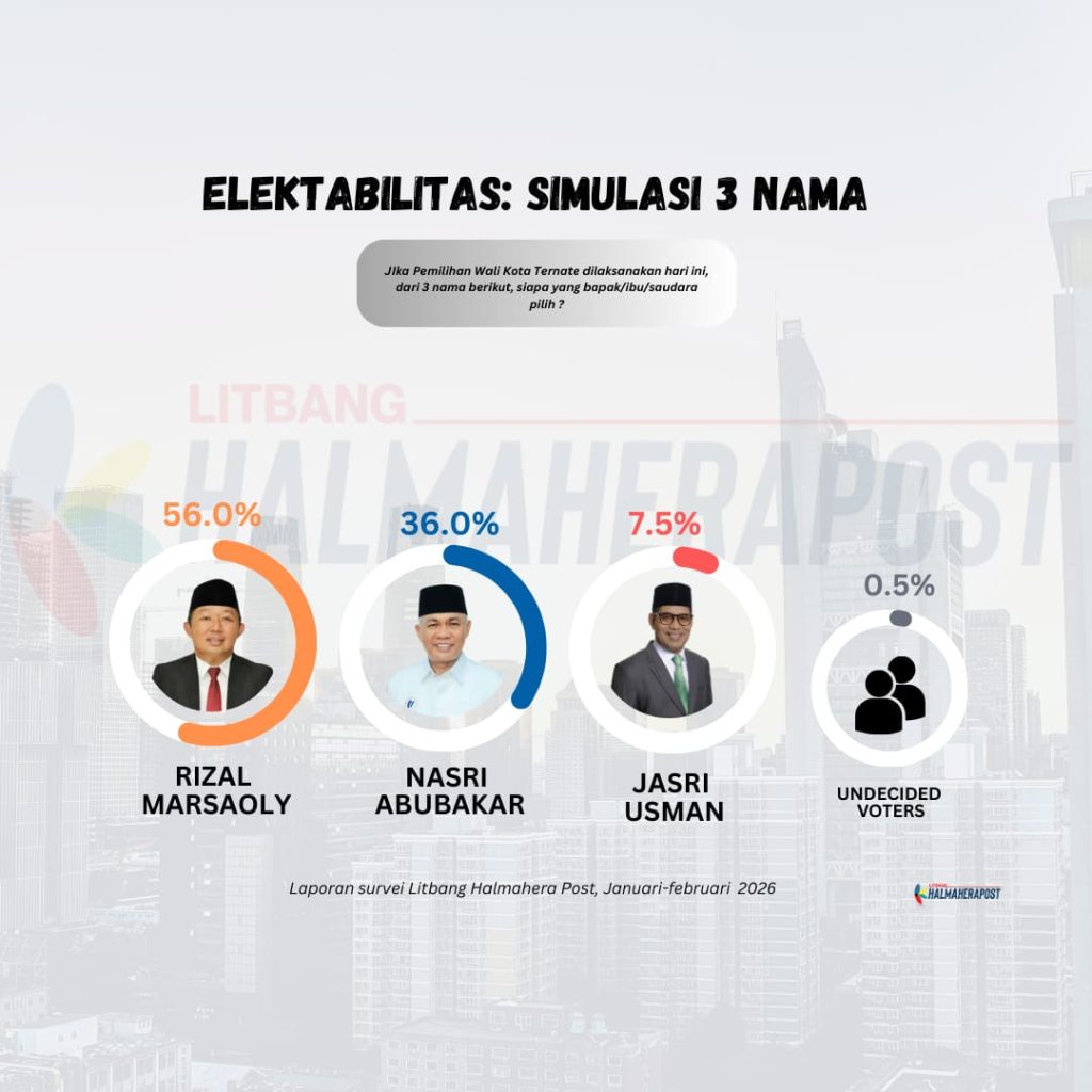 Sementara dalam simulasi tiga nama, dominasi Rizal semakin terlihat dengan capaian 56,0 persen. Nasri Abubakar berada di angka 36,0 persen dan Jasri Usman 7,5 persen. Pada skema ini, angka pemilih yang belum menentukan pilihan tinggal 0,5 persen, menunjukkan kecenderungan polarisasi dukungan.