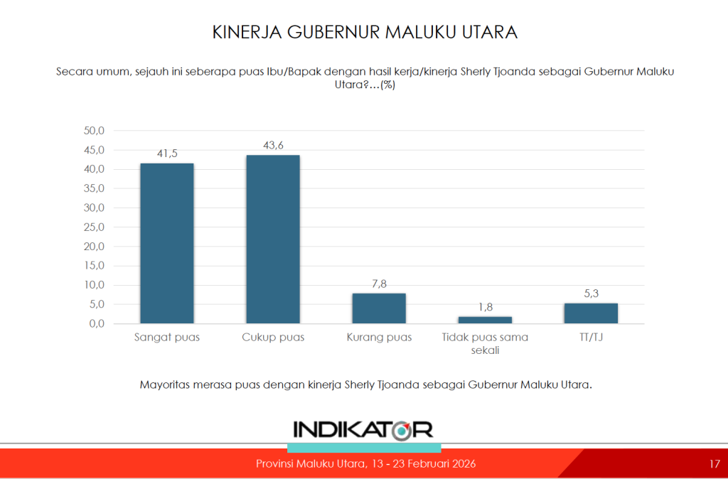 Data tersebut terungkap dalam survei yang dirilis Indikator Politik Indonesia pada periode 13–23 Februari 2026. Survei melibatkan 820 responden di seluruh kabupaten/kota di Maluku Utara dengan margin of error ±3,5 persen pada tingkat kepercayaan 95 persen.