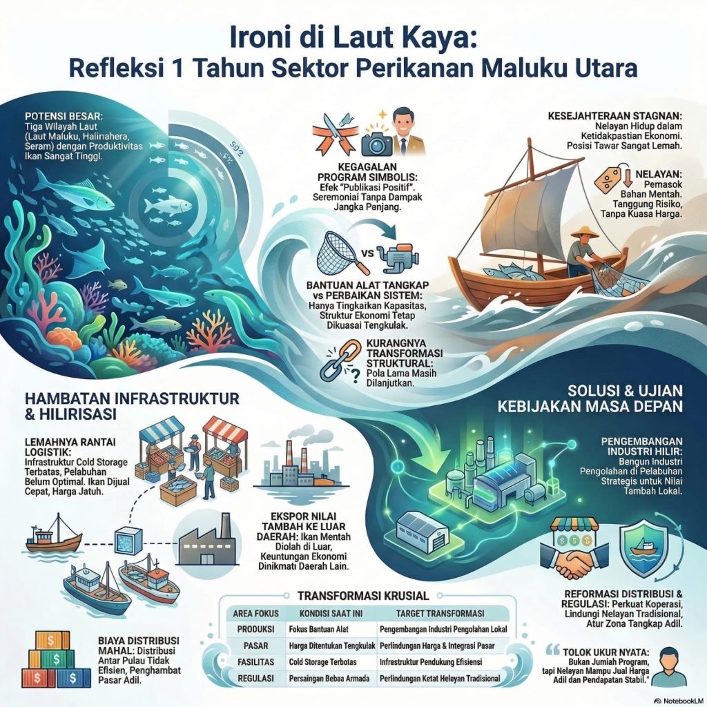 Sektor perikanan Maluku Utara bukan hanya soal menangkap ikan akan tetapi indikator keberpihakan pemerintahan terhadap masyarakat pesisir dan kualitas kepemimpinan regional. Dalam konteks ini, satu tahun pemerintahan Sherly Tjoanda dan Sarbin Sehe menjadi ujian nyata, bukan sekadar periode administratif.