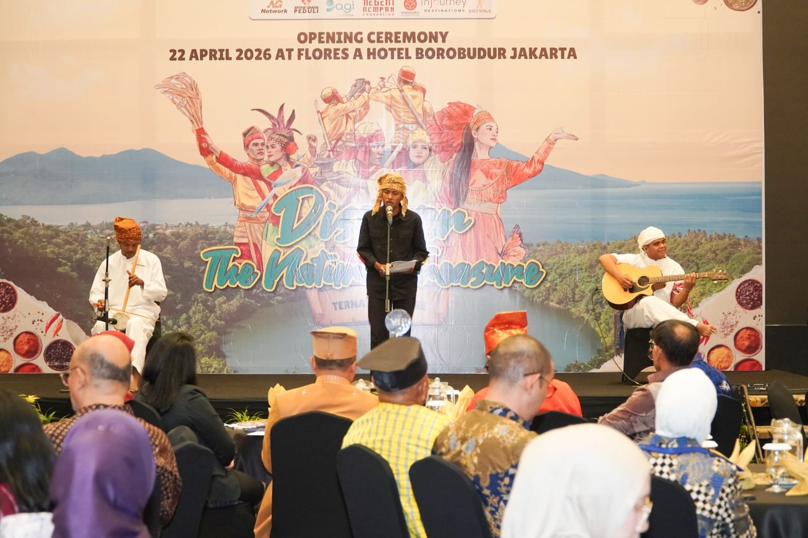 Suasana Opening Ceremony eksibisi Discovery The Natural Treasure Tidore & Ternate di Ruang Flores A, Hotel Borobudur Jakarta, Kamis, 22 April 2026, berlangsung meriah dengan penampilan kolaborasi seni anak muda Tidore Kepulauan.