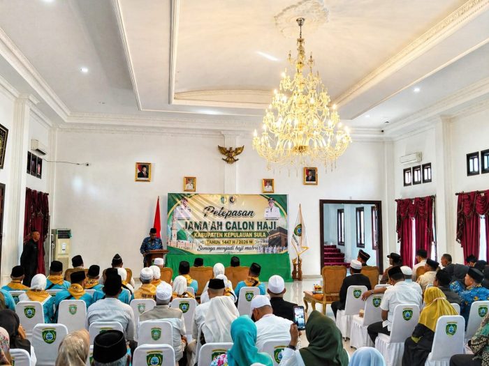 Wakil Bupati Kepulauan Sula, M. Saleh Marasabessy, melepas 16 Jemaah Calon Haji (JCH) asal daerahnya dalam prosesi yang berlangsung khidmat di Aula Istana Daerah Dadah Hia Ted Sua, Desa Mangon, Kecamatan Sanana, Senin, 27 April 2026.