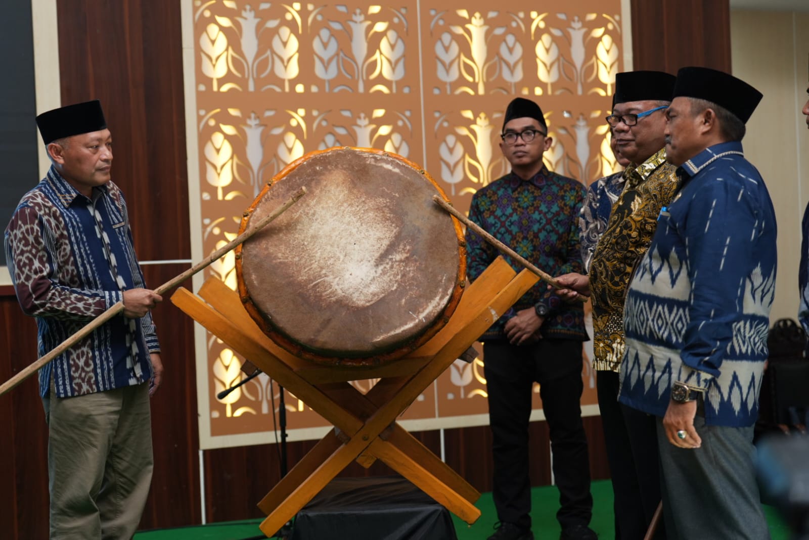 Wakil Gubernur Maluku Utara, Sarbin Sehe bersama Sekda Samsuddin A. Kadir dan Kepala Kantor Haji dan Umrah Maluku Utara saat memukul beduk tandanya pelepasan JCH. Foto: Humas Pemprov Malut